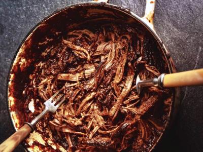 Meanwhile, remove the brisket from the rack and pull the meat apart using a fork. Add the shredded brisket to the simmering sauce along with any juices left in the roasting tray. Bring back to a very low simmer and cook for a further 10-15 minutes. Turn the heat off and put the pan to one side.