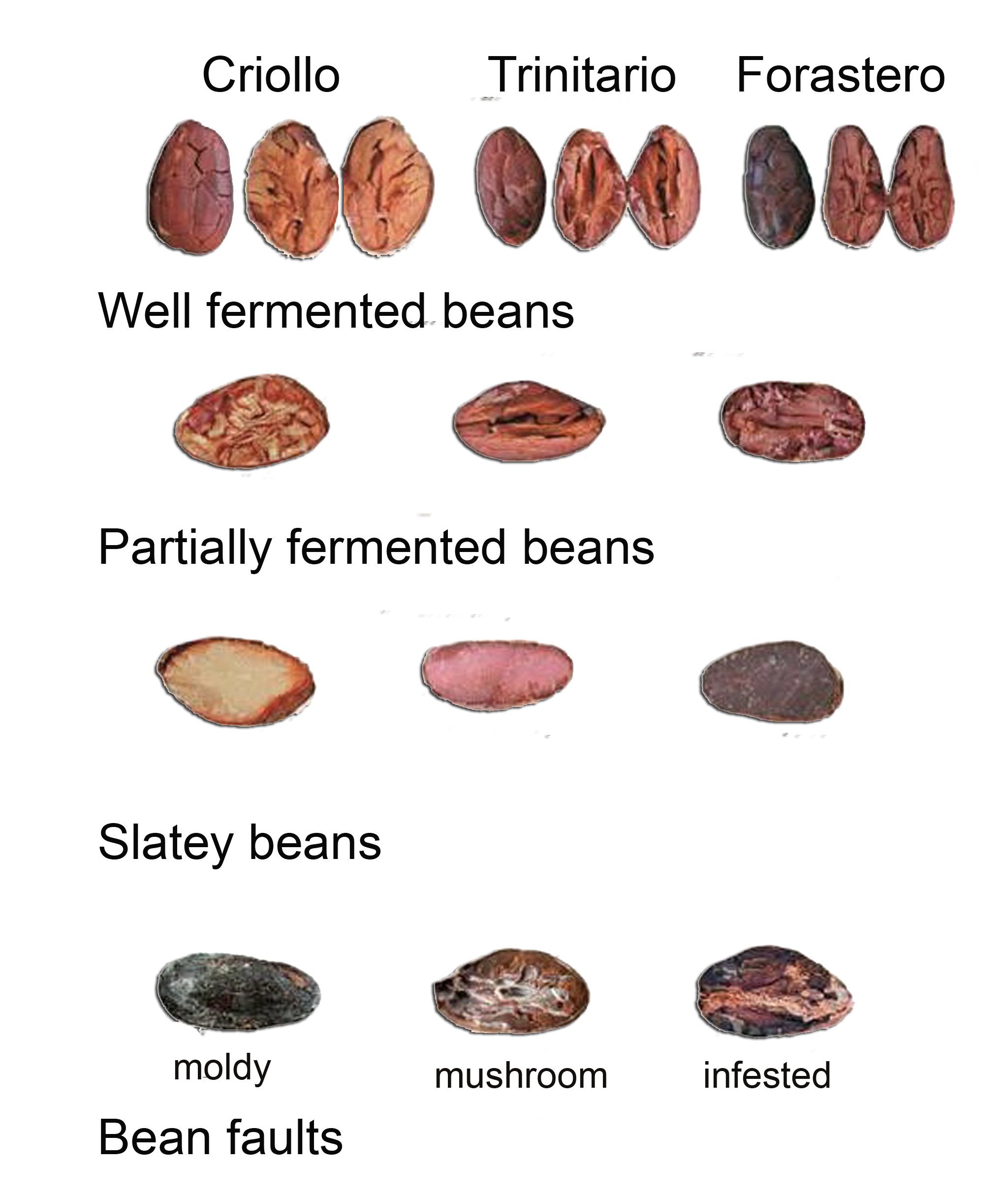If a large number of samples in a batch have mold, are slaty (not grooved, but slick and greyish), or have germinated beans (the germ and/or cotyledon are still present), the batch is useless and should be destroyed. Farms that have more than one varieties of cacao can find it difficult reaching consistency in cut tests, each variety can respond to fermentation differently, so a batch with mixed varieties is unlikely to give consistent cut tests results.
